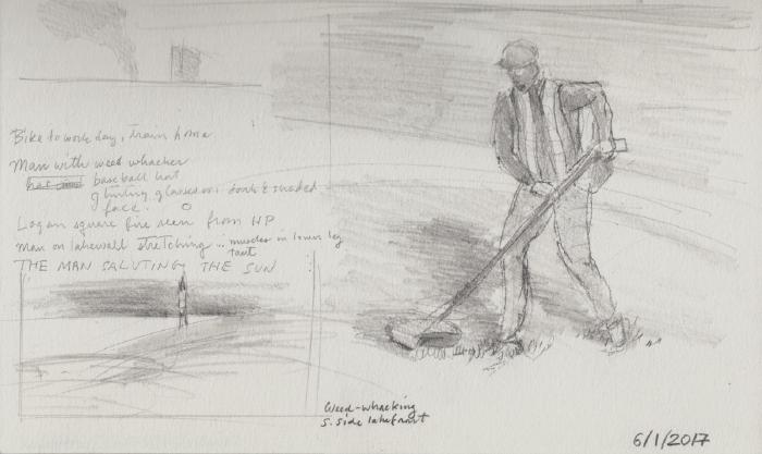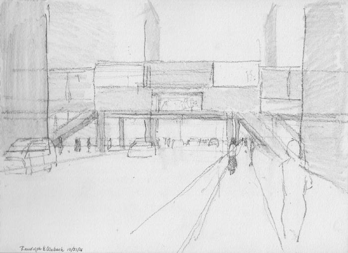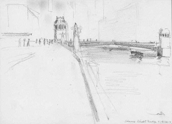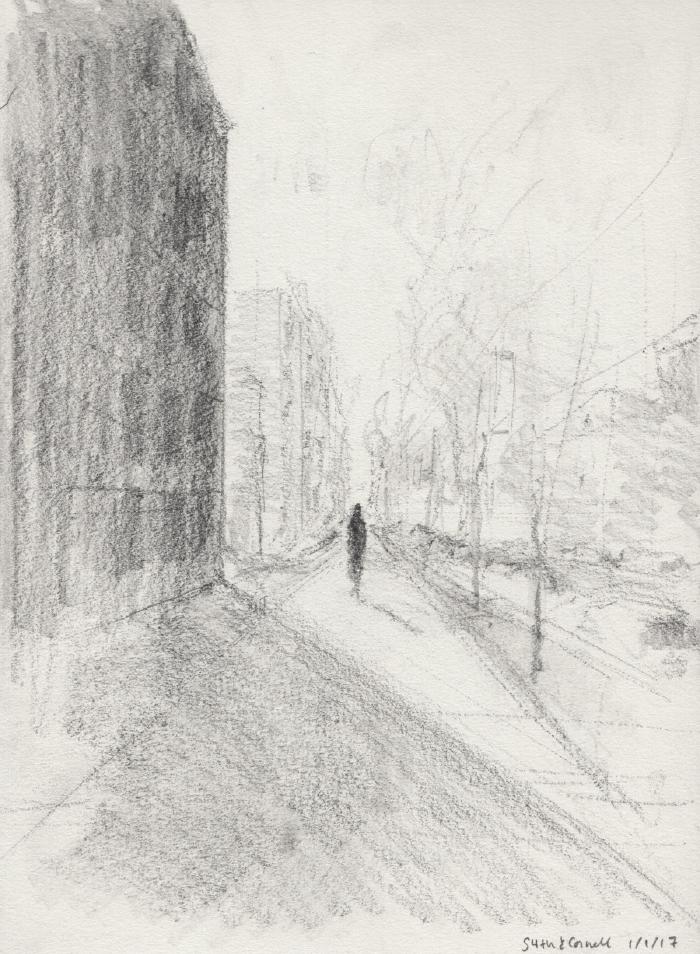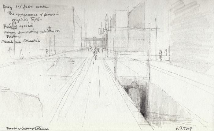 A much bigger change occurred in my ability to notice things, and my emotional response to them was amplified. Knowing that I needed material for a drawing at the end of the day simply opened my eyes more. It was like going on vacation somewhere totally new. I saw things in my neighborhood, and on my commute, that I had passed by without noticing for years: the shapes and placement of signs, light poles, fire hydrants; the construction and weathering of steel supports for elevated trains; the multitudes of ornamental details on buildings. The endless variety of people's faces… commuters, shopkeepers, construction workers, homeless men and women; the smiles, grim stares (especially at commute times) or lines of care they bore; their postures and gestures (all too often, in relationship to their phones); the cut and fit of their clothing, coats, boots or shoes. The endless repetitive movements of pigeons, and the surprising variety of other birds (sparrows, hawks, cranes, herons, geese, ducks, swallows, and several migratory bird species I couldn't identify). The printed word, in steel or brass relief, to be seen everywhere in streets and sidewalks, indicating lines of survey, or the origin or builders of utility covers or nearby buildings. All the endless varieties of trees, contours of trunks, branching patterns, leaves, and all the grasses, flowers and weeds of the city… these things came to my notice, were revealed fresh as though I had previously had some sort of screen over my vision that had fallen away.
