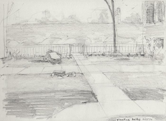 Nicolaïdes makes a point of not making a big deal of these drawings, setting a fifteen minute time limit for each. I broke this rule many times, especially at the beginning when I would try to recall as much as possible. Eventually, however, I settled for just jotting down a few things I remembered seeing (sometimes starting with just remembering where I was and what I did, which could be hard enough), and turning the most compelling memory into a small composition. Even on days when I was the most busy and distracted I could typically remember at least one thing to put down on paper. And I found there was only a loose correlation between how much effort I put into remembering things throughout any given day, and how much I liked the drawing at the end of that day. Some days I was excited about the results, and some days I was just happy to put the drawing away afterward. Part of what's good about doing something like this is you can fail over and over again, and your daily commitment to the practice means that any specific failure is no big deal.2