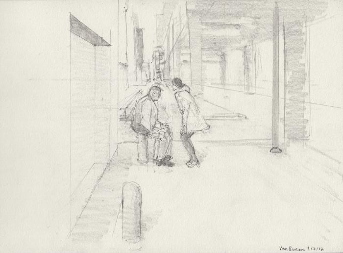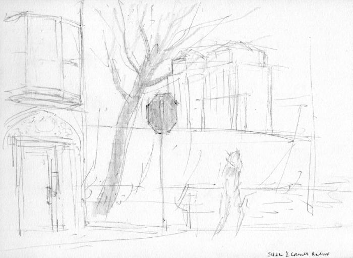 Given a relative paucity of remembered facts, how do you complete your drawing? Just as our mind fills in details about what we see without our being consciously aware of it, one can invent the elements of a scene that elude our grasp when we try to recall them. For this, a knowledge of perspective, of human anatomy and clothing, of the construction of builings and plants and trees, and especially of light and shadow are indispensible for adding extra life and believability to a composition, no matter how quickly executed. For example, I would rarely remember a specific shadow, but if I knew where I was and what time it was, I could place the shadows based on where the sun would have been at the time. Used skillfully, invention can also amplify whatever emotional response led one to record the scene in one's mind to begin with.