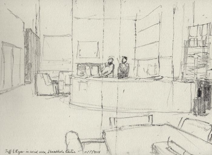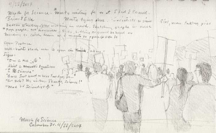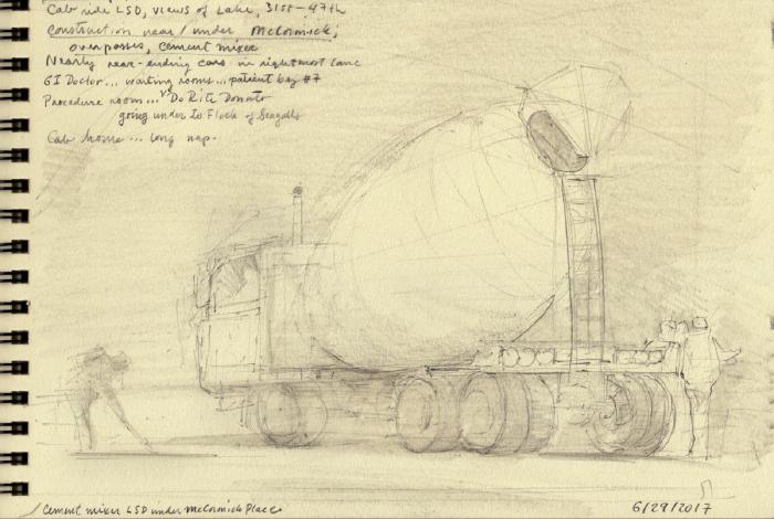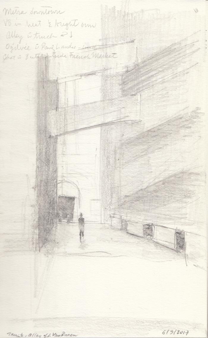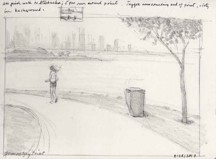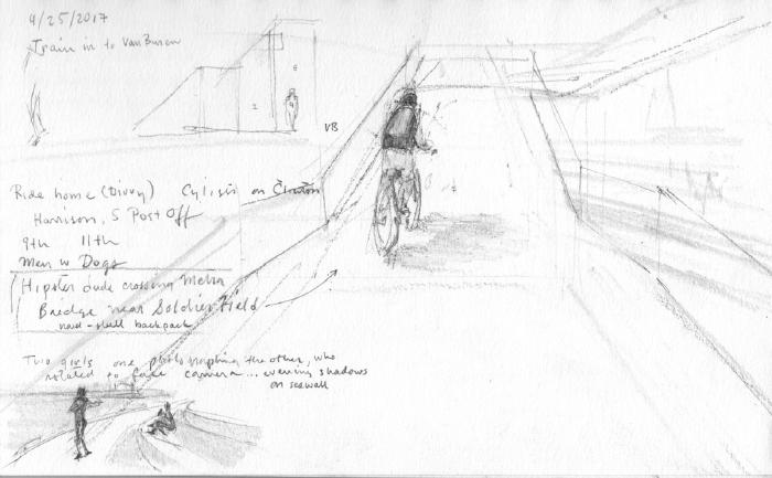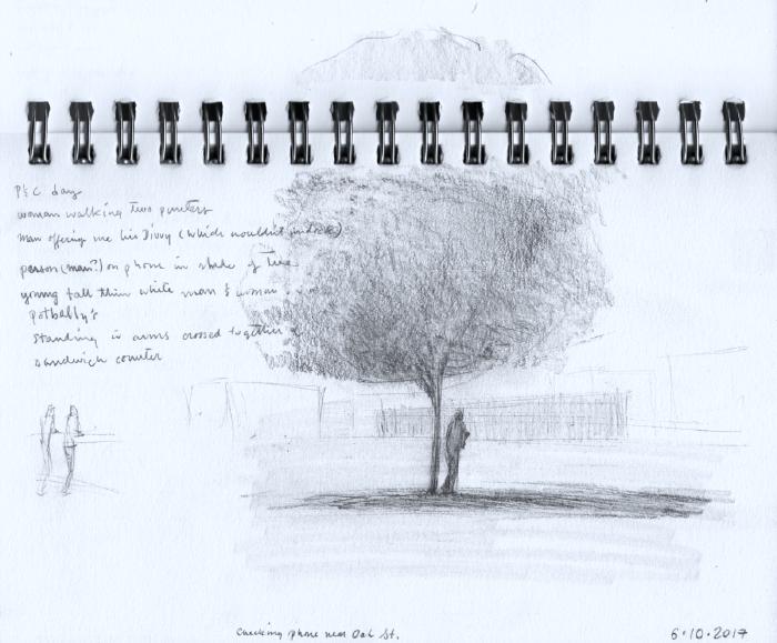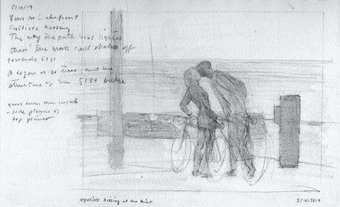 - Re-remember things. If I saw something I wanted to "save up" for the evening's drawing, then whenever I saw something else that looked interesting, I would look carefully at it, but then I would use the whole noticing-something-noteworthy experience as a reminder to remember the other thing I was trying to remember also. In other words, every new thing I noticed became a reminder to remember the other thing. Occasionally, I would build a list of things to remember and would then go through the list items one-by-one whenever this occurred.