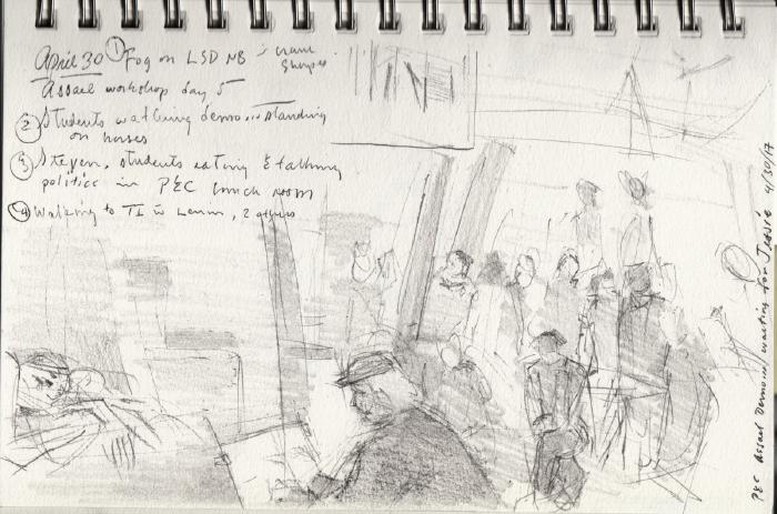 I often noticed that, after drawing something that occurred in a specific place, my memory would be strongly affected by whatever inventions (or mistakes) I came up with to compensate for my ignorance of the drawing's setting. For this reason, I sometimes disliked looking at the drawings after the fact because they were so clearly wrong and they interfered with my "real" memory of where the event occurred. An easy remedy for this was just to go back to the place in question and look around. One sees many more details the second time around, and it's always amusing and humbling to realize how wrong you got it the first time.