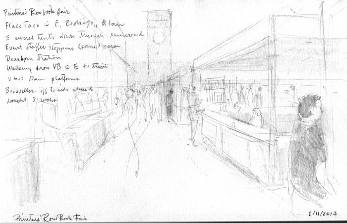 During the course of the year, I didn't actually get that much better in terms of the sheer number of details I could recall. A half dozen "facts" (the size and shape of a doorway; the size and number of windows in a storefront; the particular shape of a woman's boots), along with a rough gesture for and/or placement of the key figures, were about as I could expect for any given day's drawing.