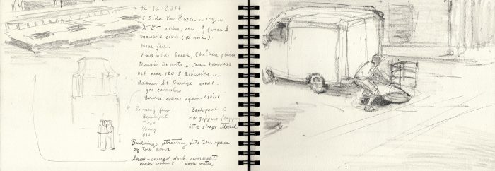 Since I usually make the drawing at the end of the day, several hours will have passed by the time I get around to recording what I saw. To keep this purely about memory (with bits of invention as needed), I don't allow myself any notes or photo references. As a result, while going about my day, I need to work extra hard to have a chance to remember the things I see. Sometimes I'll stop on the street and spend extra time looking at something, perhaps making little drawing gestures in the air to build a little muscle memory about the shapes, and no doubt drawing a stare or two from passersby. Other times if I've seen something transitory while walking I'll look down at the sidewalk and go over the scene in my mind with minimal distraction from new visual inputs.