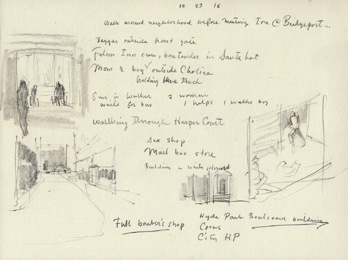 When I sit down to draw, I first make a list of all the things I can remember seeing, sometimes accompanied by small thumbnail sketches.