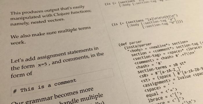 My impressions, after doing this project in just a few hours, are that (1) literate programming is great fun; and (2) Instaparse sets a new standard for power and expressiveness when converting structured text into abstract syntax trees. If you have a DSL or some other text-based, formal language you want to parse, and you are either literate in Clojure or interested in becoming so, Instaparse would be a great tool to check out.